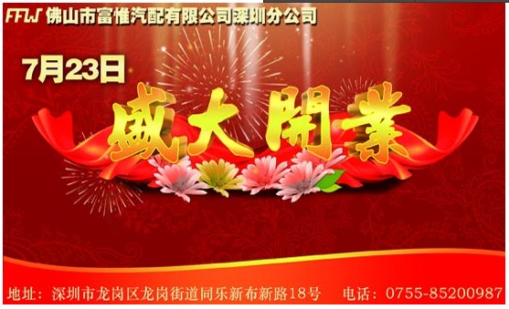 In July 23, 2013, Foshan Fu Wei Auto Parts Co., Ltd. Shenzhen branch in Guangdong Province Shenzhen city Longgang District Longgang Street fun new Bu Xin Lu, 18, held a grand opening ceremony. The company will continue to adhere to the customer demand, customer satisfaction for the purpose, wholeheartedly with the vast number of old and new friends from all walks of life, hand in hand to create brilliant!